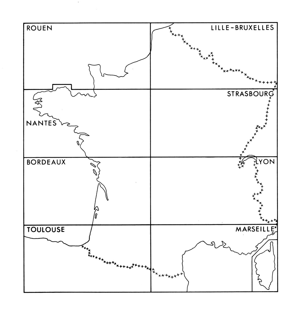 4 - La carte des gisements de fer (et de manganèse) de la France à 1/1 000 000 en 2 feuilles (BRGM-1963) 5 - La carte des gîtes minéraux de la France à 1/320 000 (BRGM, 1960-64), en 14 feuilles (fig. 1) couvre seulement les régions les plus intéres-santes au point de vue des gîtes métallifères (Massif Central, Massif Armori-
