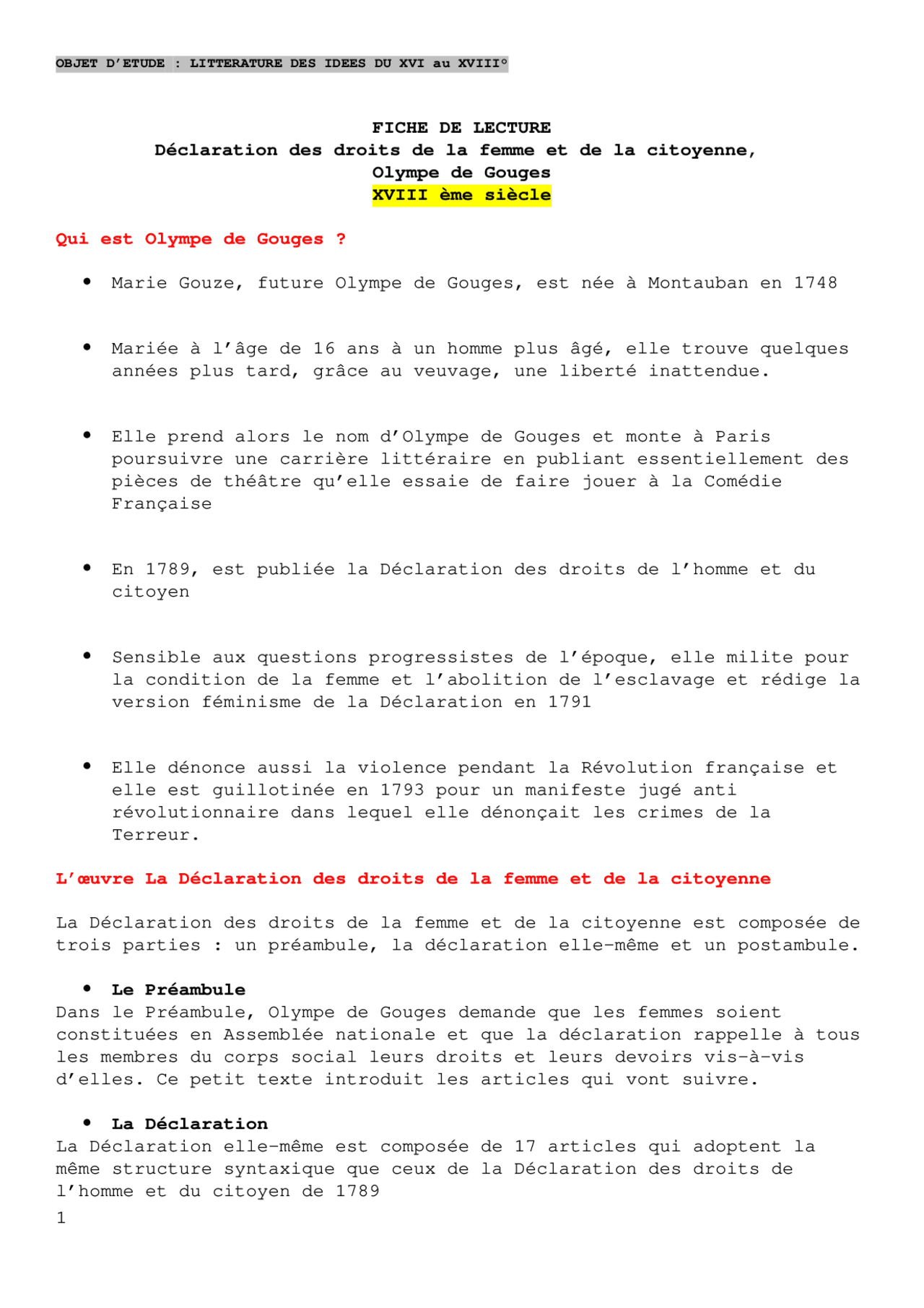 FICHE DE LECTURE Déclaration des droits de la femme et de la citoyenne, Olympe de Gouges