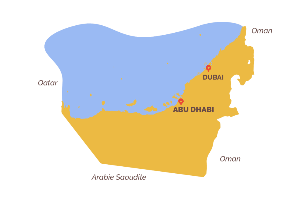 Abu Dhabi se trouve au sud de l'émirat de Dubaï. A l'est d'Abu Dhabi, on trouve le sultanat d'Oman. En allant vers le sud, le pays partage une frontière dans le désert avec l'Arabie Saoudite qui est le grand pays de la région. A l'ouest, on trouve le Qatar mais Abu Dhabi n'a pas de frontière physique avec ce pays.