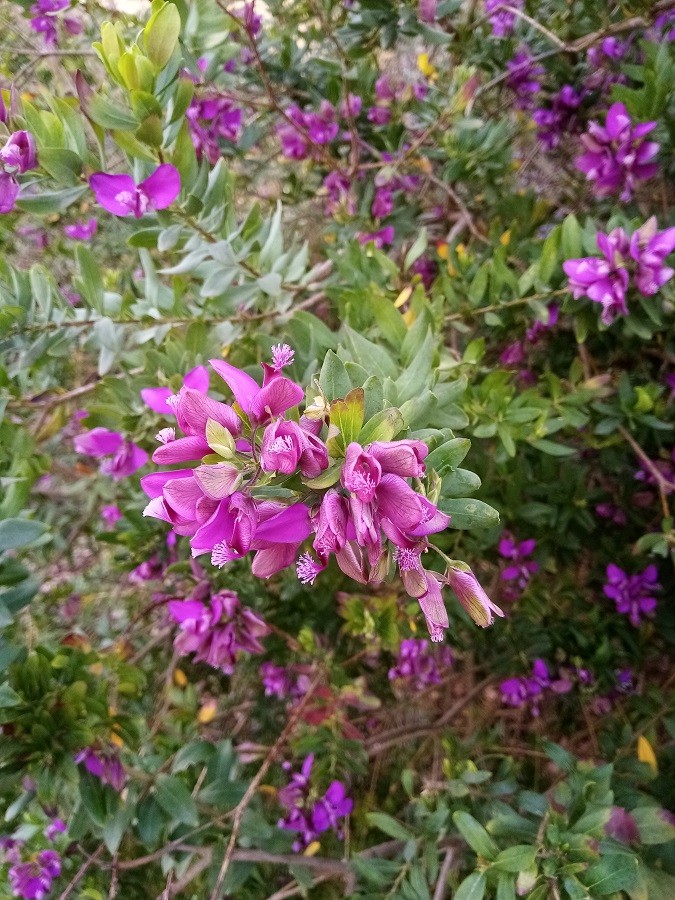 Nom commun : Polygale à feuilles de Myrte, nommé par les anglophones 'September bush, Cape milkwort, Butterfly Bush, Myrtle-leaf Milkwort', en Afrique du sud 'Augustusbossie'. Nom latin : Polygala myrtifolia L. famille : Polygalaceae. catégorie : arbuste à ramification courte, les jeunes pousses sont pourprées. port : érigé, dense et.