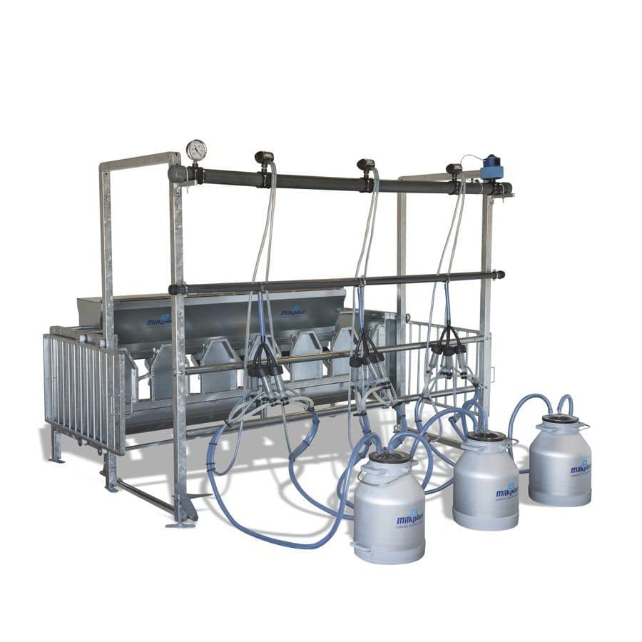 La salle de traite mobile est conçue pour la fixation de 6 animaux (chèvres ou moutons) en même temps et est équipée de sas, d'une barrière arrière, de portes d'entrée et de sortie et de rampes. Chaque place de traite est équipée d'une mangeoire en plastique. Les sas de tête et les barrières sont actionnés par des leviers.