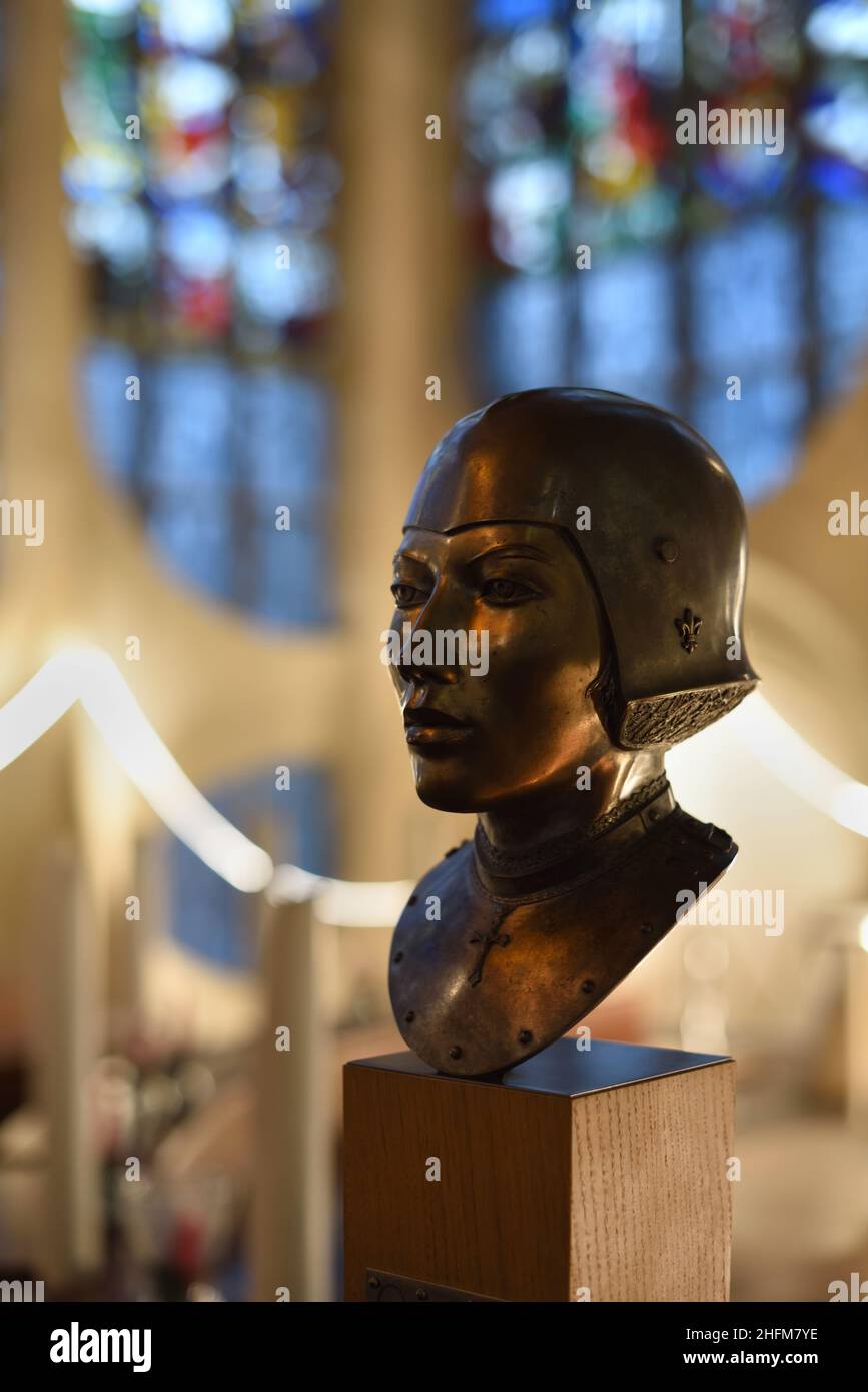 Buste en métal de Jeanne ou d'Arc à l'intérieur de l'intérieur moderne de l'église Eglise Sainte